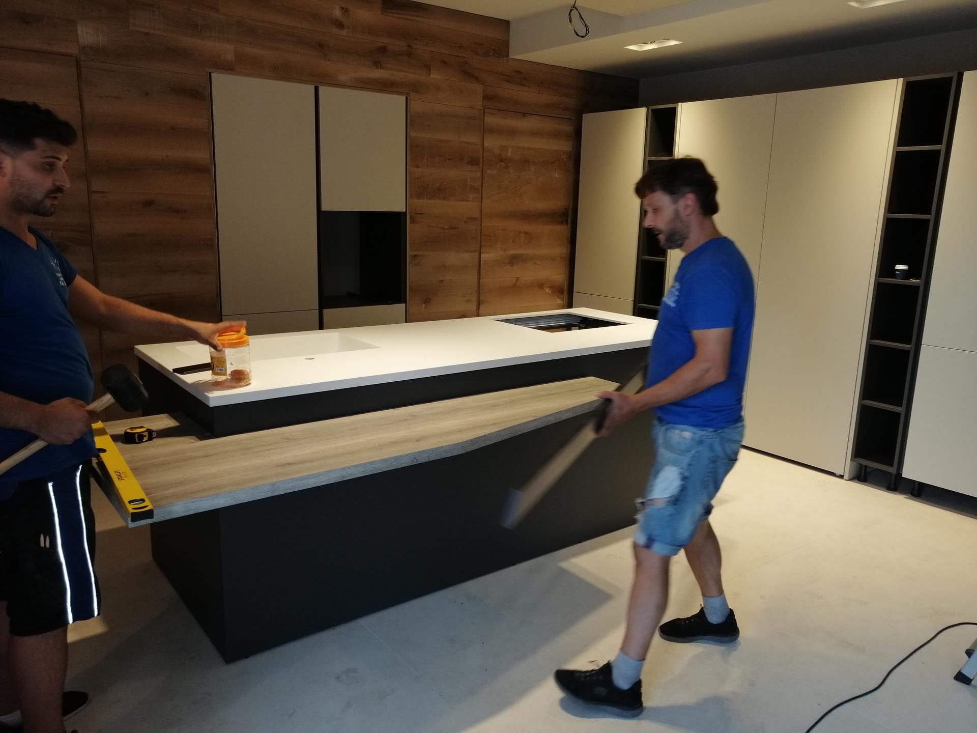 Cucina realizzata in un contesto minimal, linee pulite rivitalizzando il PET con una pareti interamente rivestita dal calore del legno. Top in Corian materiale duttile e morbido al tatto. Questa composizione ha la particolarità delle ante a scomparsa che rendono la cucina ulteriormente lineare ma allo stesso tempo estremamente attrezzata.